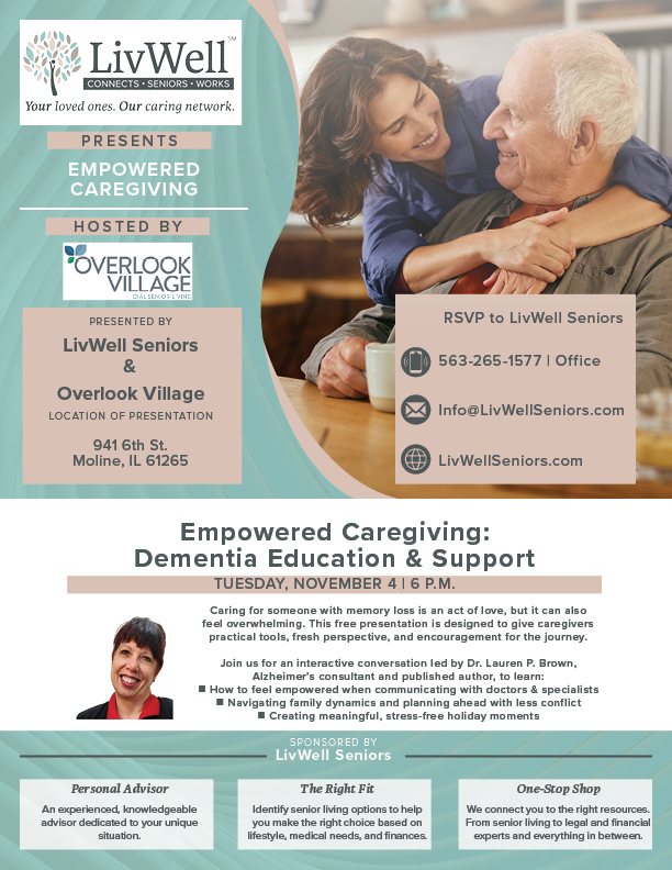 LivWell Seniors is partnering with Lauren P. Brown, award-winning author and Alzheimer’s expert, to bring a series of free educational seminars on caregiving for loved ones with dementia to Quad Cities. The seminars will be at 6 p.m. on these…
