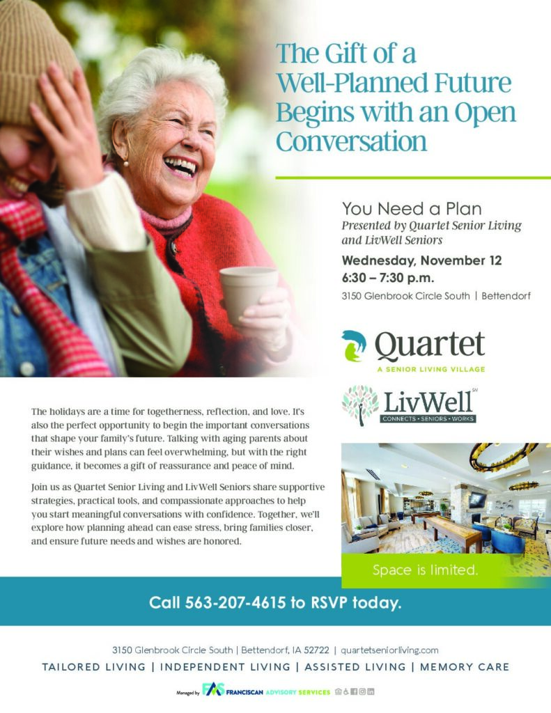 LivWell Seniors and Quartet – A Senior Living Village are teaming up to host “You Need a Plan,” a free educational presentation designed to help older adults and their families begin the important conversations about the future before a crisis occurs.