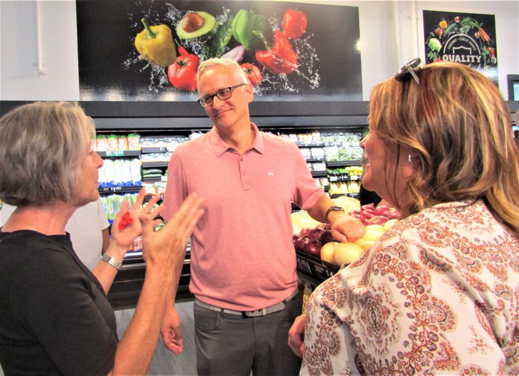 Steve Geifman, managing partner of GRT QC Properties, talks with guests Tuesday, Aug. 29, during a VIP opening event at the new Fareway Meat & Grocery store in LeClaire. CREDIT DAVE THOMPSON