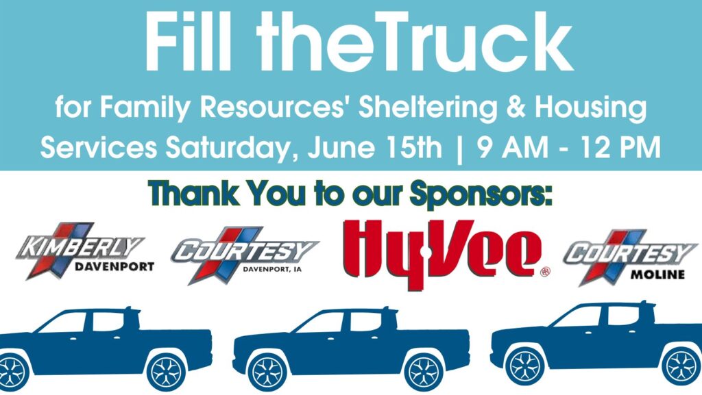 Family Resources staff and volunteers will be collecting new basic need items outside of 12 Quad Cities area Hy-Vee stores from 9 a.m. to noon on Saturday, June 15, during a “Fill the Truck” campaign.
