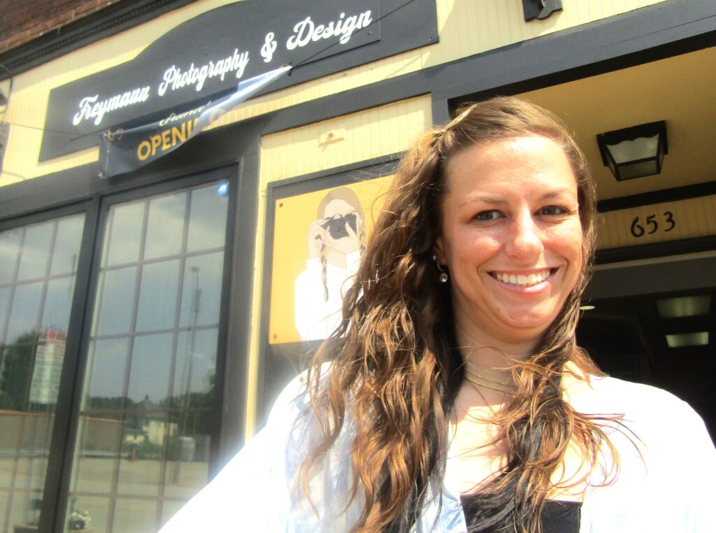 Emily Freymann, the owner of Freymann Photography & Design in East Moline, stands in front of her new business Saturday, July 13. CREDIT DAVE THOMPSON