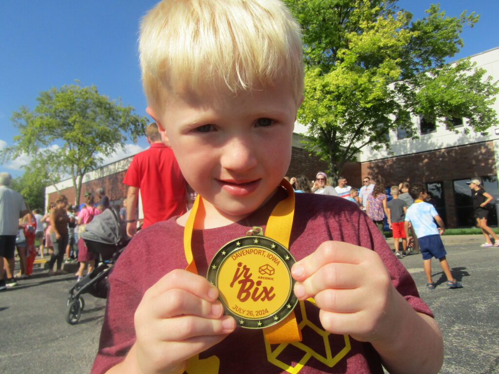 The Bettendorf boy proudly showed off the racing medal to everybody around him. That’s because he had just completed the Genesis Outpatient Pediatric Therapy Center (GOPEDS)  version of the Arconic Junior Bix run…