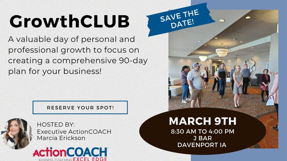 GrowthCLUB will host a business workshop from 8:30 a.m.-4 p.m. Thursday, March 9, at The J Bar, 4215 Elmore Ave., Davenport.
