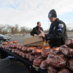 Mr. Cernin and dozens of other Hy-Vee employees – plus several officers from the Davenport Police Department and volunteers with local food pantries – were busy at work getting those hams ready for the crowd. At about 2:30 p.m., about 15 volunteers started placing hundreds of hams on a series of tables to make it an easier, more efficient process of handing them out to people in the vehicles.