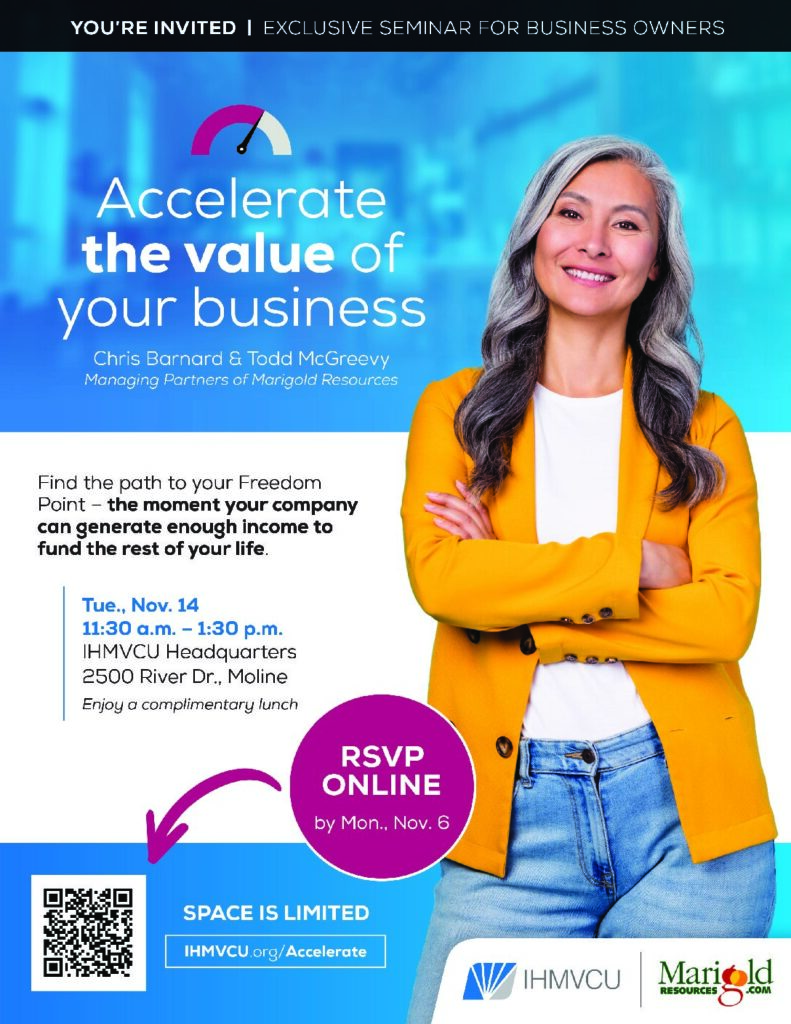 Business owners can learn how to increase the value of their businesses at an exclusive seminar hosted by IHMVCU on Tuesday, Nov. 14, at the credit union’s headquarters in Moline.
