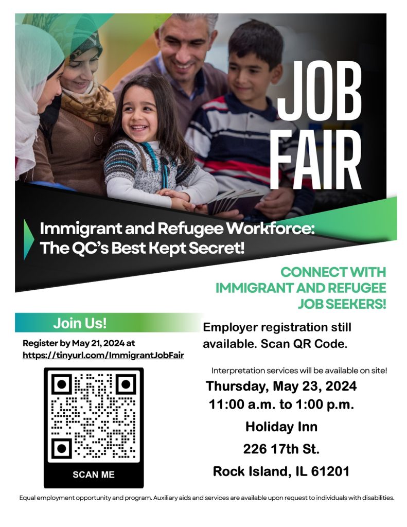The Immigrant Workforce Job Fair: The QC’s Best Kept Secret! will be held from 11 a.m. to 1 p.m., Thursday, May 23, at the Holiday Inn, 226 17th St., Rock Island.
