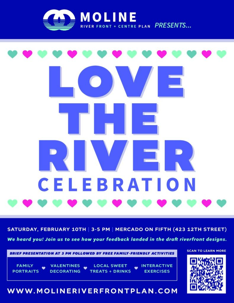 The City of Moline and Renew Moline will host a Moline riverfront ‘Love the River’ Celebration on Saturday, Feb. 10, to update the community on how its feedback was applied to riverfront design drafts.