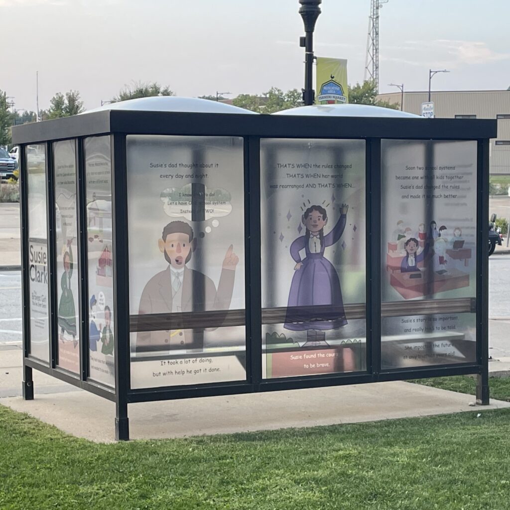 Artwork from the children’s book “Susie Clark: The Bravest Girl You’ve Ever Seen" fills the windows of the Muscatine City Hall bus shelter to honor a local girl who helped desegregate U.S. schools. CREDIT MUSCATINE PUBLIC TRANSIT