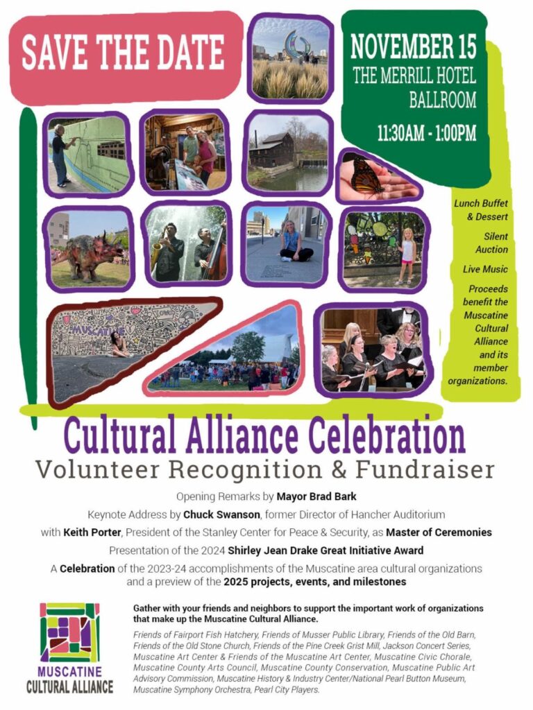 The institutions, which represent the performing and visual arts, placemaking, and Muscatine’s local history, will host their Cultural Alliance Celebration: Volunteer Recognition & Fundraiser on Friday, Nov. 15. The luncheon will be from 11:30 a.m. to 1 p.m. at the downtown Merrill Hotel Ballroom. Doors open at 11 a.m. Tickets are $55 or $500 for a table of 10.