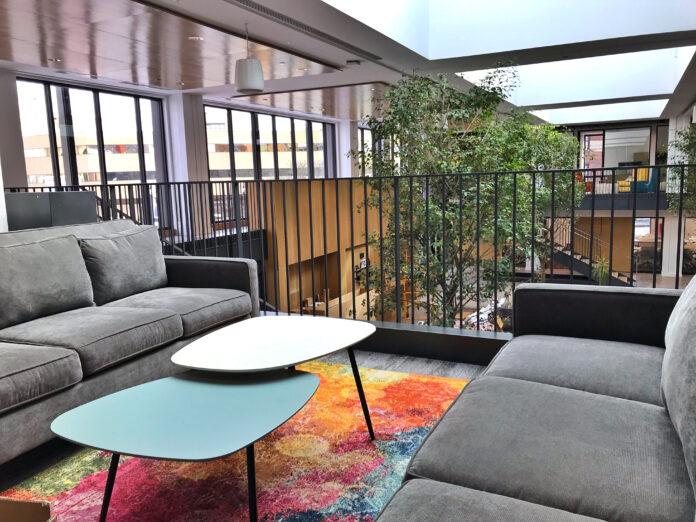 This tree-lined atrium was designed to provide a comfortable space for casual business conversation at the new Stanley Center in Muscatine. CREDIT STANLEY CENTER