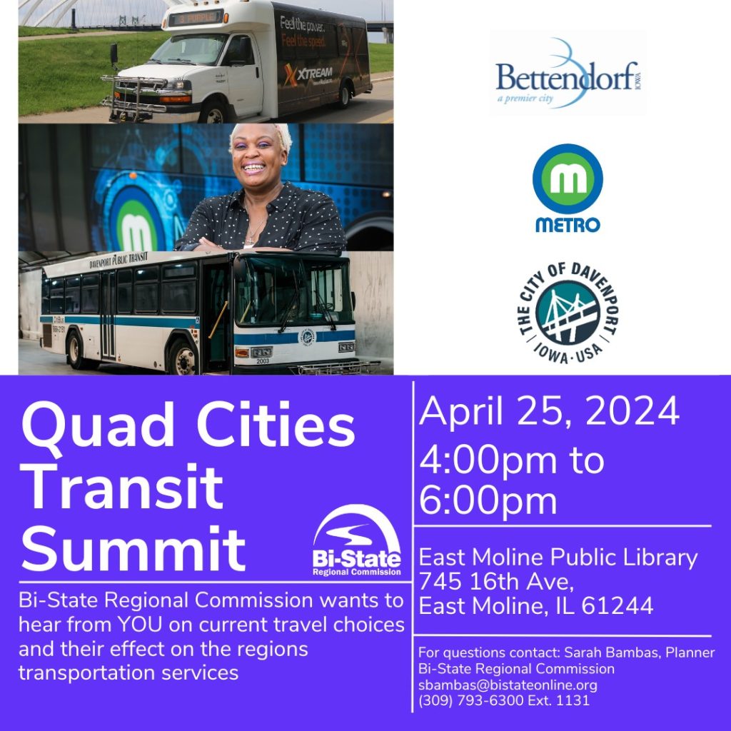 Bi-State Regional Commission will host an urban transit summit from 4-6 p.m., Thursday, April 25, in the Geraldine A. Baecke Meeting Center A at the East Moline Public Library, 745 16th Ave.