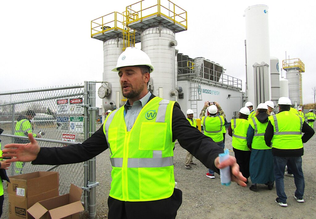 Bryce Stalcup, executive director of the Waste Commission of Scott County, helps gather a group of guests for a tour of the new WAGABOX facility that is turning harmful landfill gas into a clean, useful energy – renewable natural gas (RNG) – during a celebration on Wednesday, Nov. 19, at the Scott County Landfill. CREDIT DAVE THOMPSON