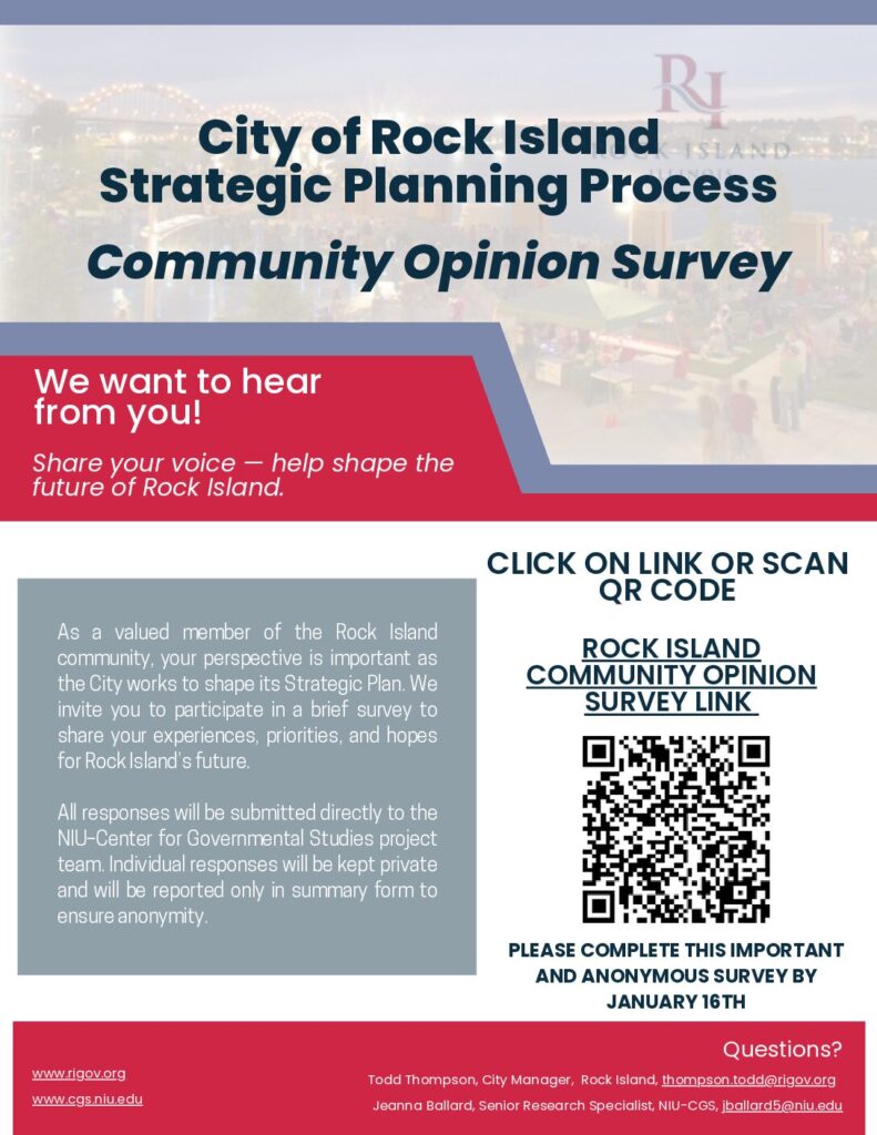 Those interested in doing so are urged to share their thoughts by Friday, Jan. 16, by answering a series of questions in the survey. Their input will be used to guide policy and decision making for the city in the coming years, the City of Rock Island said in a recent news release.