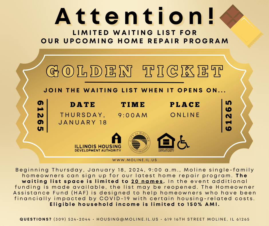 Moline residents can sign up for the Homeowner Assistance Fund Home Repair Program (HAFHR) beginning at 9 a.m. Thursday, Jan.18.