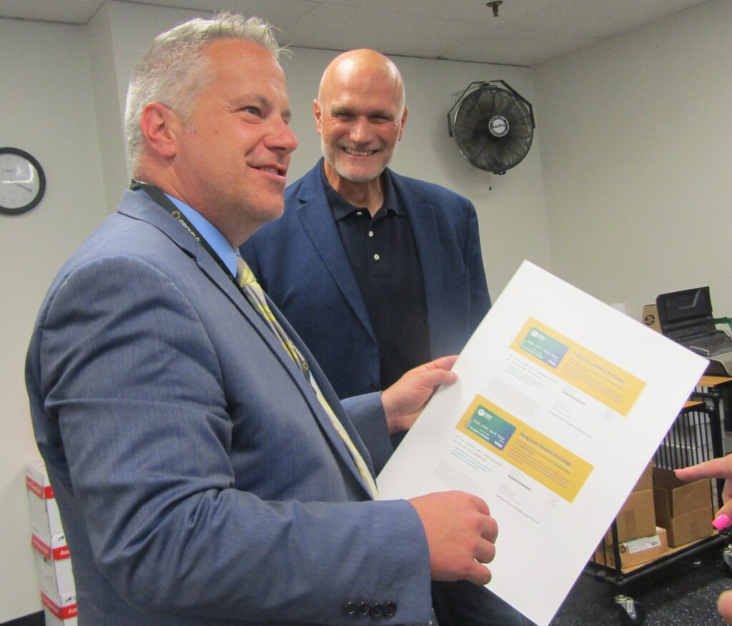 U.S. Rep. Eric Sorensen looks over printed materials, along with Paul Flemr, vice president of operations and marketing solutions at Group O, during a tour of the Milan company on Wednesday, Aug. 23. CREDIT DAVE THOMPSON