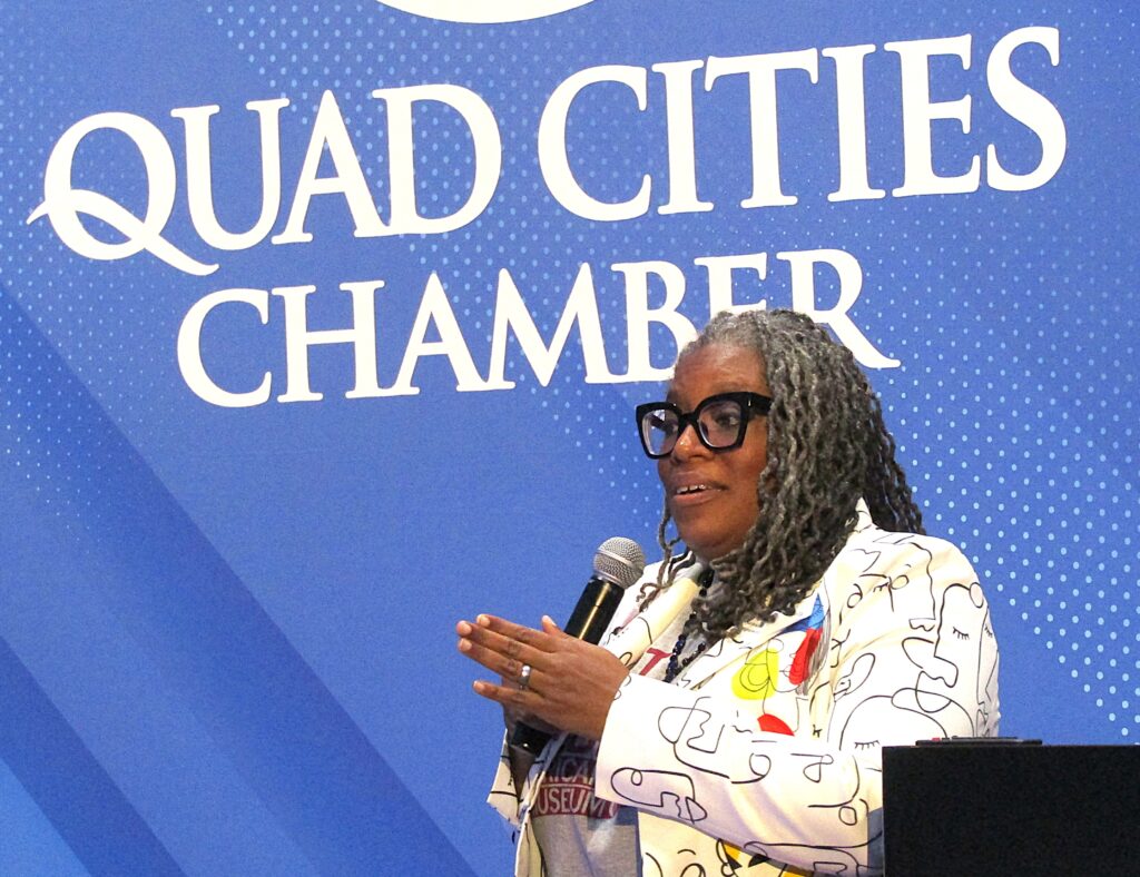 Abena Sankofa Imhotep, one of the keynote speakers at the Quad Cities Chamber of Commerce’s Minority Business Summit, gives a presentation Wednesday, Oct. 29, at the Vibrant Arena at the MARK in Moline. CREDIT DAVE THOMPSON